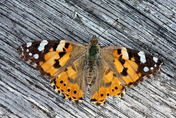The desert in winter is the coldest of places where everything sleeps until the heat remembers the wasteland created by government fires intentionally coddled to be landscape wide destruction. A sudden crash or explosion, the shattering of the sound barrier sent her flying in the December air. There! She alit upon the sun warmed wall, a vision, a sight so rare as to be a wonder. There she tested her wings before flying over the roofs of buildings, the painted lady.